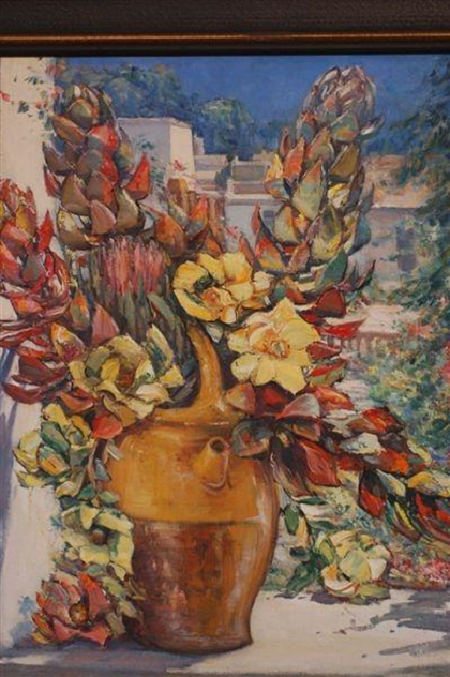Some of the best memories were the outings we enjoyed together. I remember the warm summer evenings when we went with the adults to picnic alongside the Hex River and how the unpolluted water quickly flowed over the round white stones past the damp vegetation. I remember the evening food of salad and fruit and especially the relaxed conversation until the early stars came out. Other days just us children went camping with Pieter for the day in the veld. While he walked further into the veld or went climbing in the mountain kloofs to sketch or paint, we stayed behind and prepared a picnic. The boys made a fire in a safe place and when the coals were ready to braai the meat, we’d put the black kettle on as well to boil water for coffee. When he returned, he usually brought plant material back with him – Leucadendron spp. [tolbossies], Stoebe spp. [slangbos] and succulents for his garden. The foliage was for the yellow stone jar at home which he arranged himself on the bookcase in the lounge, just stick in and straighten, finish & klaar.