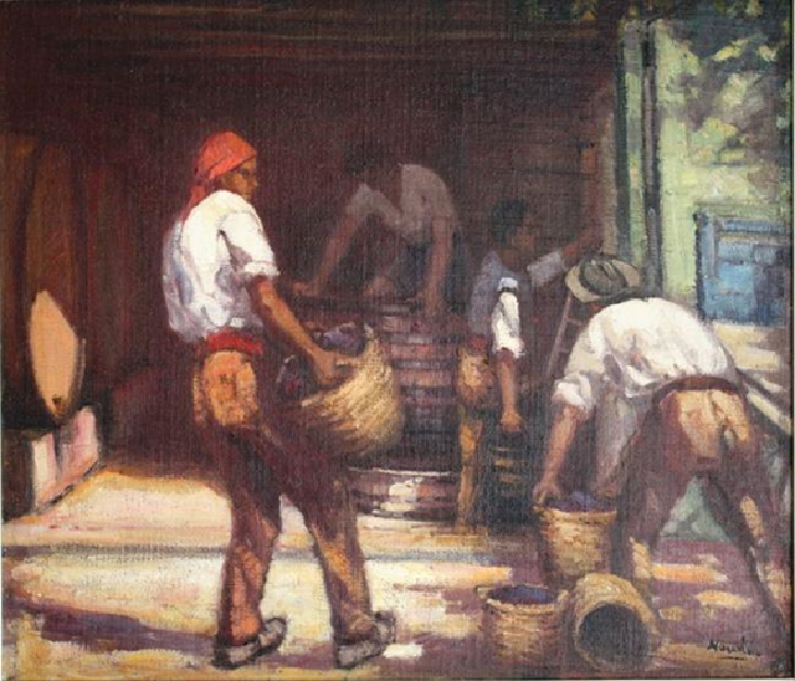 wider pencil stripes straight down and across create a farmyard with labourers around the wine press